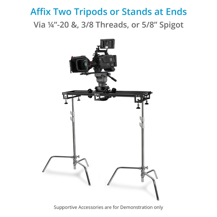 Additionally, it can be mounted on two tripods or stands at either end of the slider using the provided ¼”-20 & 3/8”-16 threads or a 5/8” spigot