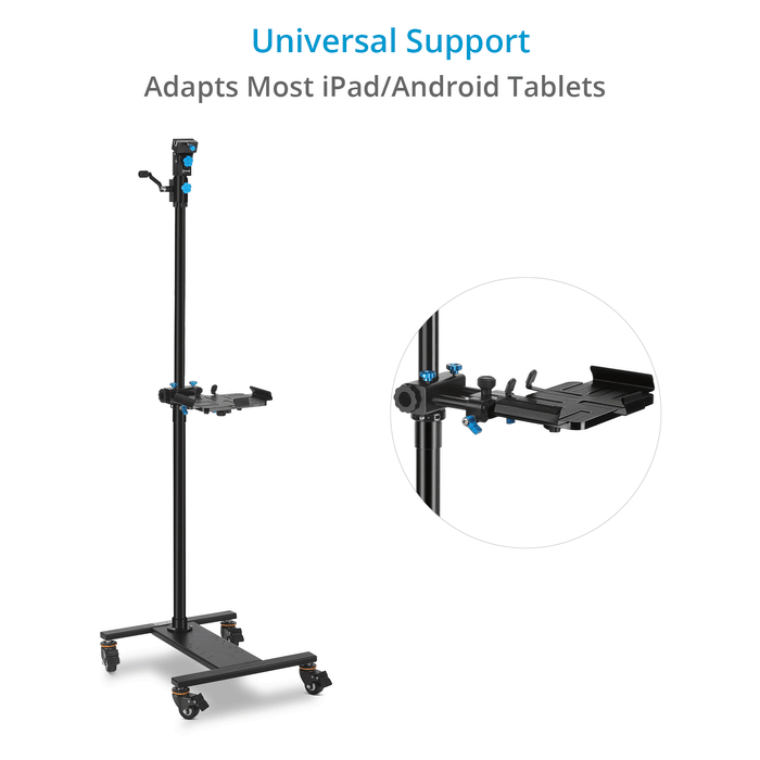 The telescopic stand features four wheels with brakes that allow you to transport and spin the stand 360° for proper positioning.