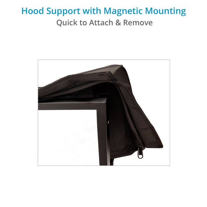 The hood is removable and attaches quickly via a magnetic strip.