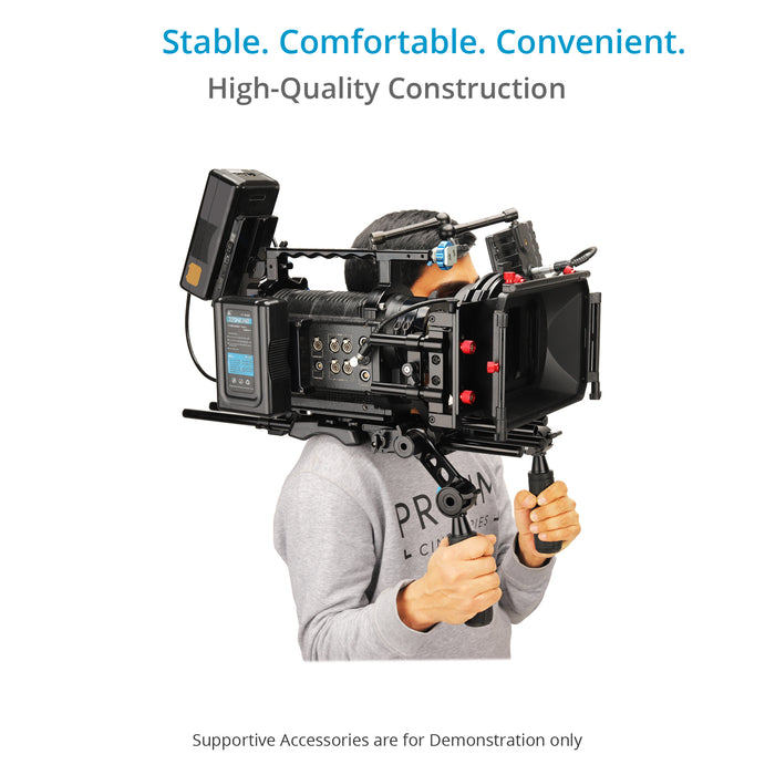 The shoulder pad allows the rig to sit comfortably on your shoulders by eliminating the discomfort caused by the camera's weight on your shoulder during shooting.