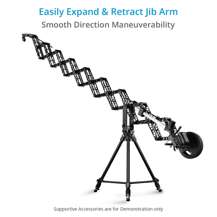 The kit comes equipped with a Remote Control and a Controller Box which has a battery plate; it adapts a 15V V-Mount Battery to power and drives the jib arm smoothly.