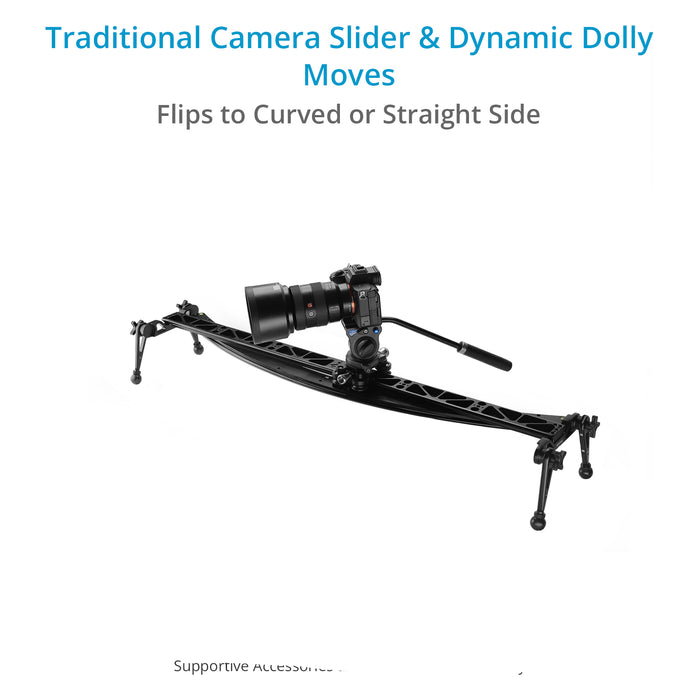 It is a dual track that combines straight and curved tracks in a single design, letting you achieve traditional camera slider moves as well as dynamic dolly moves by quickly flipping the slider.