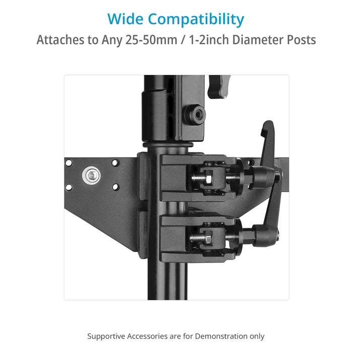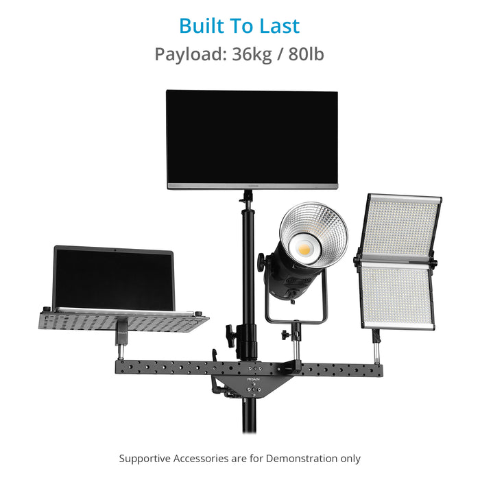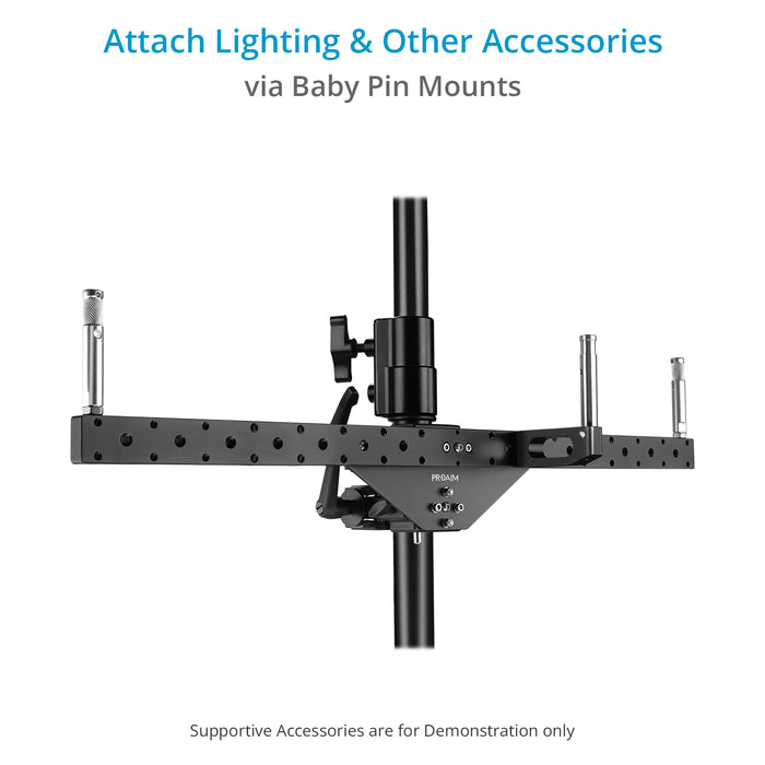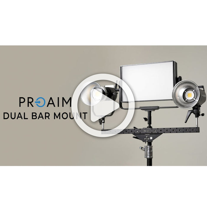 Introducing our Dual-Bar Mount- Designed to effortlessly mount up to two monitors and an array of accessories, this bar seamlessly integrates with grip carts or stands and accommodates various accessories with its versatile baby pin mounts and different-sized mounting holes.