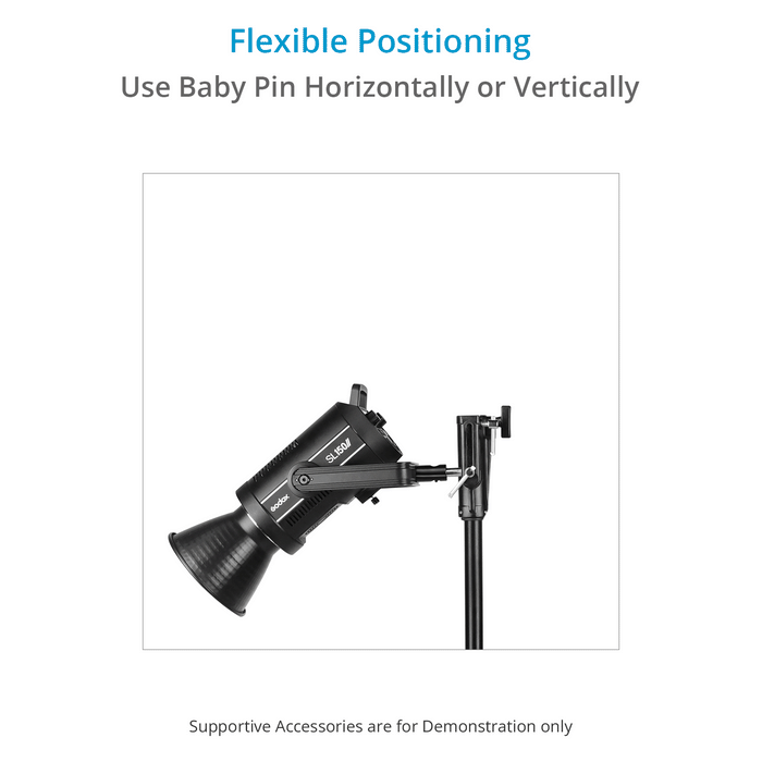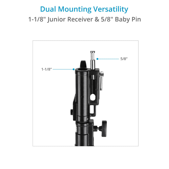 The stand’s combo head includes a 1-1/8” Junior receiver and a retractable 5/8” Baby pin, supporting a wide range of equipment. This configuration offers extensive compatibility for cameras and lighting setups.