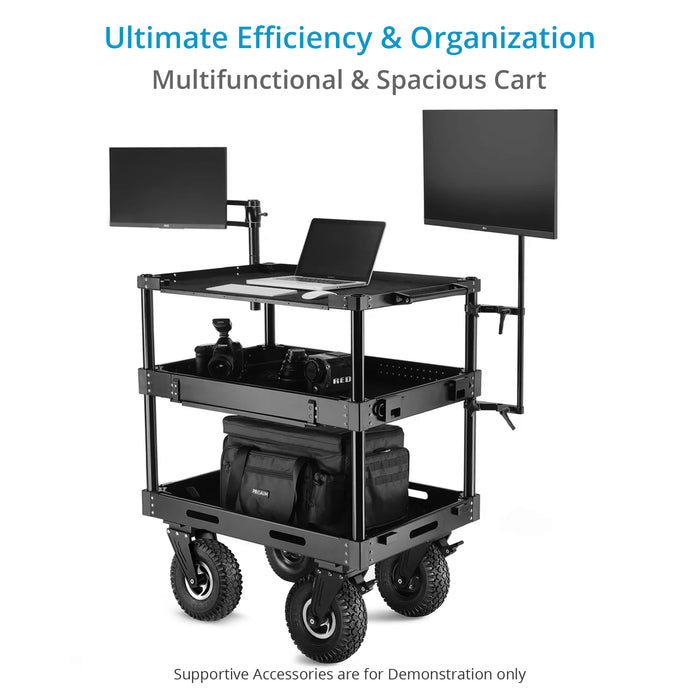 With over 50 accessory options, this versatile cart transforms into a DIT, Sound, Lighting Cart, or Equipment Dolly. The built-in cheese plate on the top shelf brings limitless possibilities, so you can customize it to fit any production need.