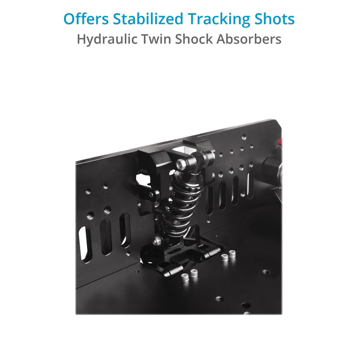 It has hydraulic twin shock absorbers on both sides of the Rickshaw to reduce shocks and provide stabilized shots.