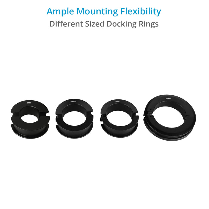 Additionally, the bracket set comes equipped with docking rings of three different sizes, i.e., 30mm, 38mm, 42mm & 54mm, thus providing ample mounting flexibility by securely clamping stabilizer rods of different thicknesses with a push-lever mechanism.